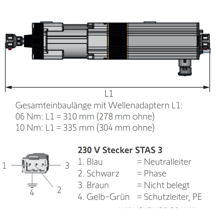 Bitte beachten Sie auch die geänderten Abmessungen L1 und den Standort des Auflaufpilzes bei einem Austausch eines defekten schon verbauten Somfy Antriebes.
